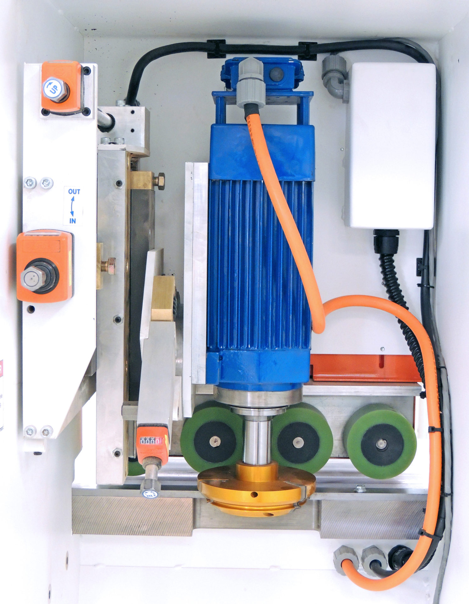 Shapes the edge of solid wood and plywood parts in one pass to produce a precision lock miter joint. Eliminates the doweling process. The A12 Miter Lock Shaper machine’s shaping station is equipped with a precision-balanced drive motor/spindle combination. The spindle is equipped with vertical, horizontal, and tilt adjustments.