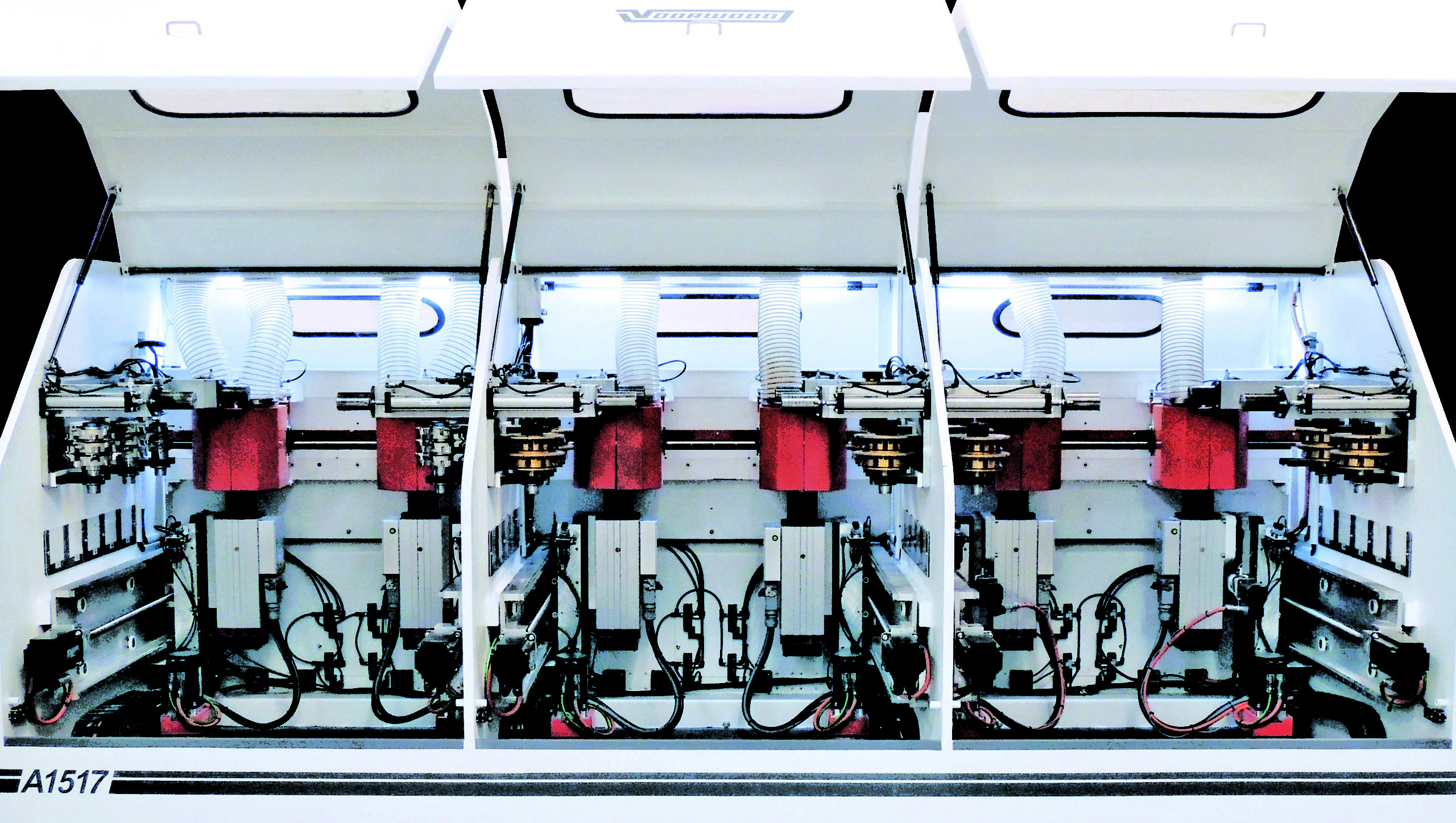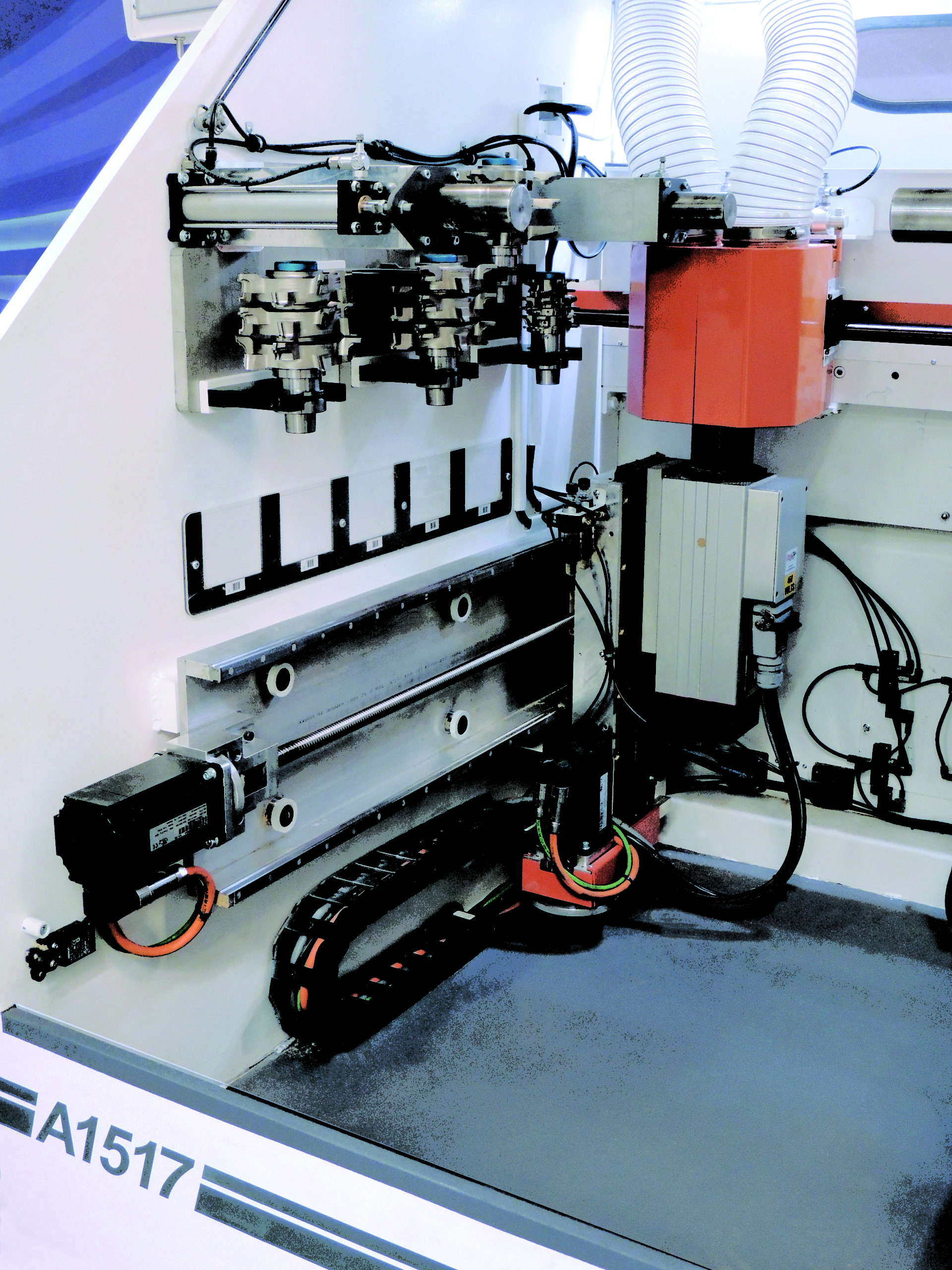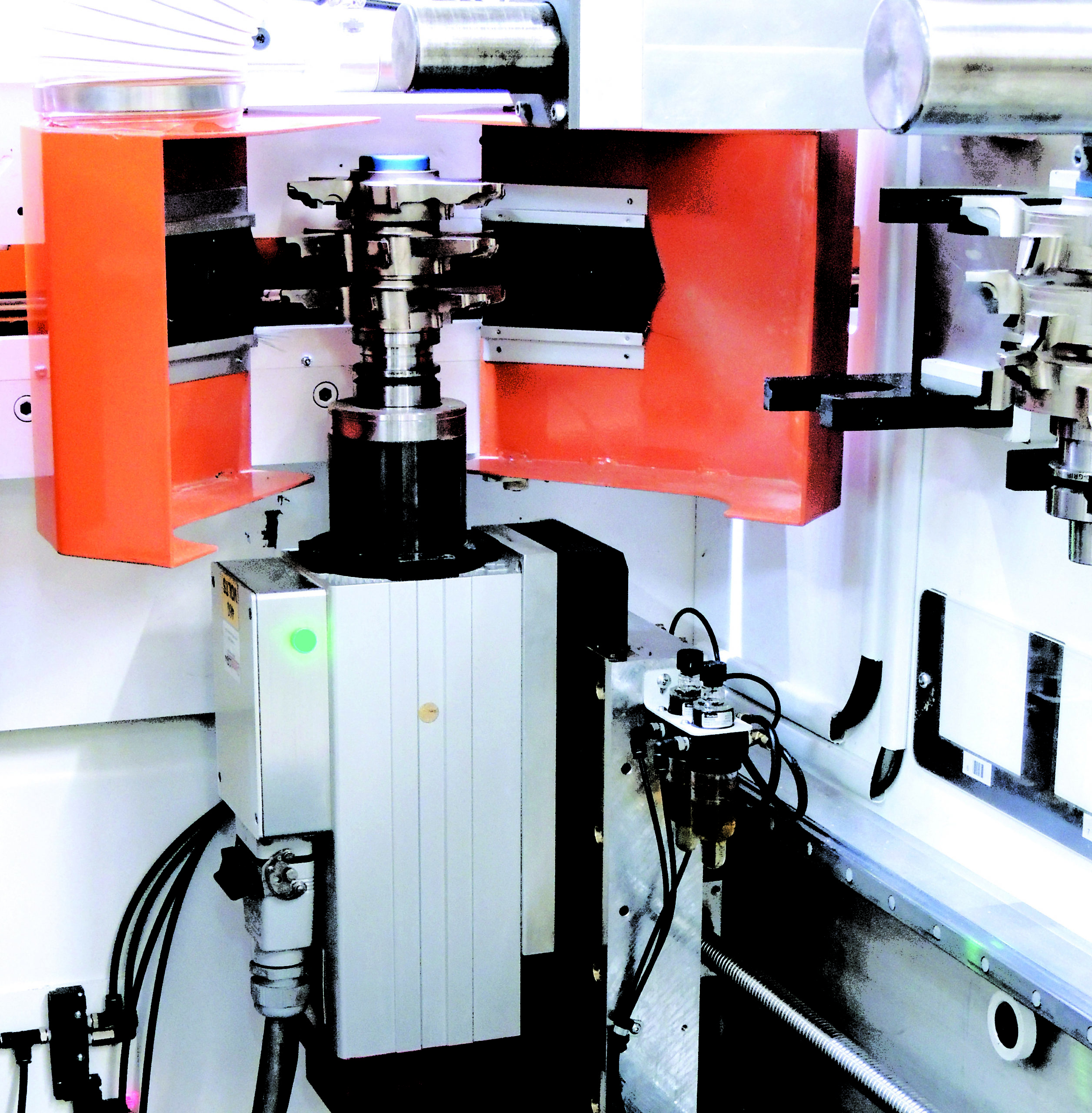 Can accommodate five or more stations with identical HSK-63F spindle motors, to be used in any configuration of shaping and sanding. All spindles are reversing and set up to rotate with or against the direction of feed with a jump feature on the first station. The stations can be horizontally locked for straight shape/sand or CNC controlled.