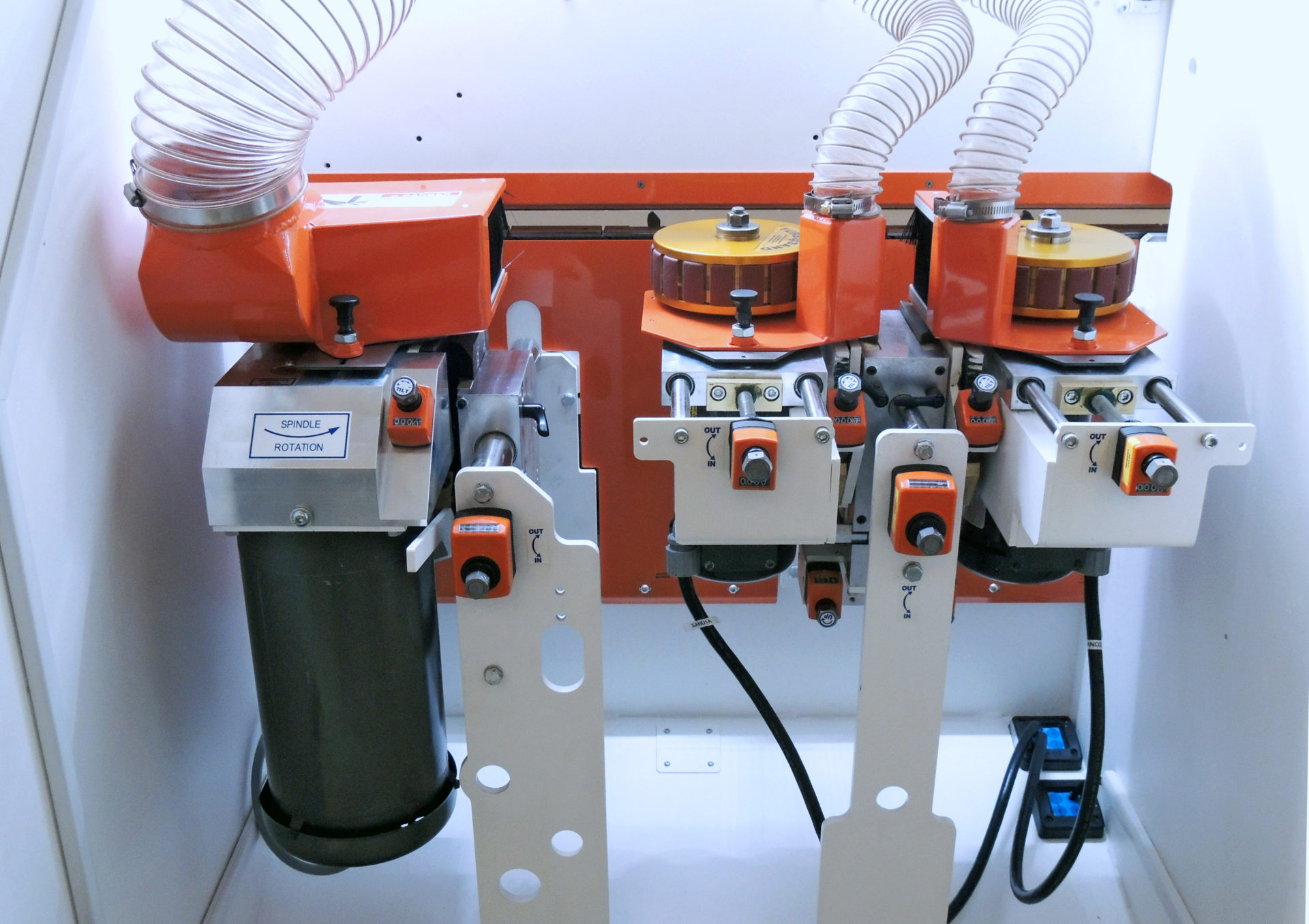 Profiles and sands both edges of hardwood parts in one continuous pass. Each side of the machine is comprised of two shaping units that make the same cut to prevent end grain tear-out. The first shaper rotates with the feed direction. As the substrate passes, the station jumps in to make a short but full depth cut on the substrate’s trailing edge.