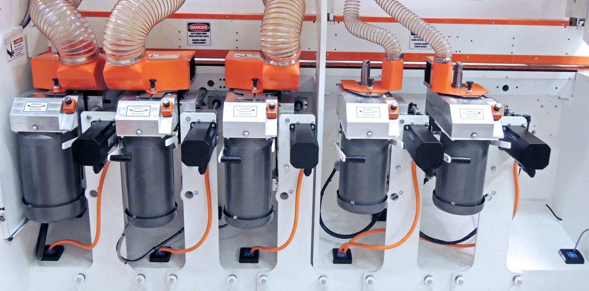The A517 Single-End Tenoner can accommodate five or more shaping/sanding stations. Clockwise and counter-clockwise rotations are used on specific shapers to eliminate rejects and produce the highest quality finished part. A PLC controlled servo motor drives the shaper horizontally as a function of the transporter speed.