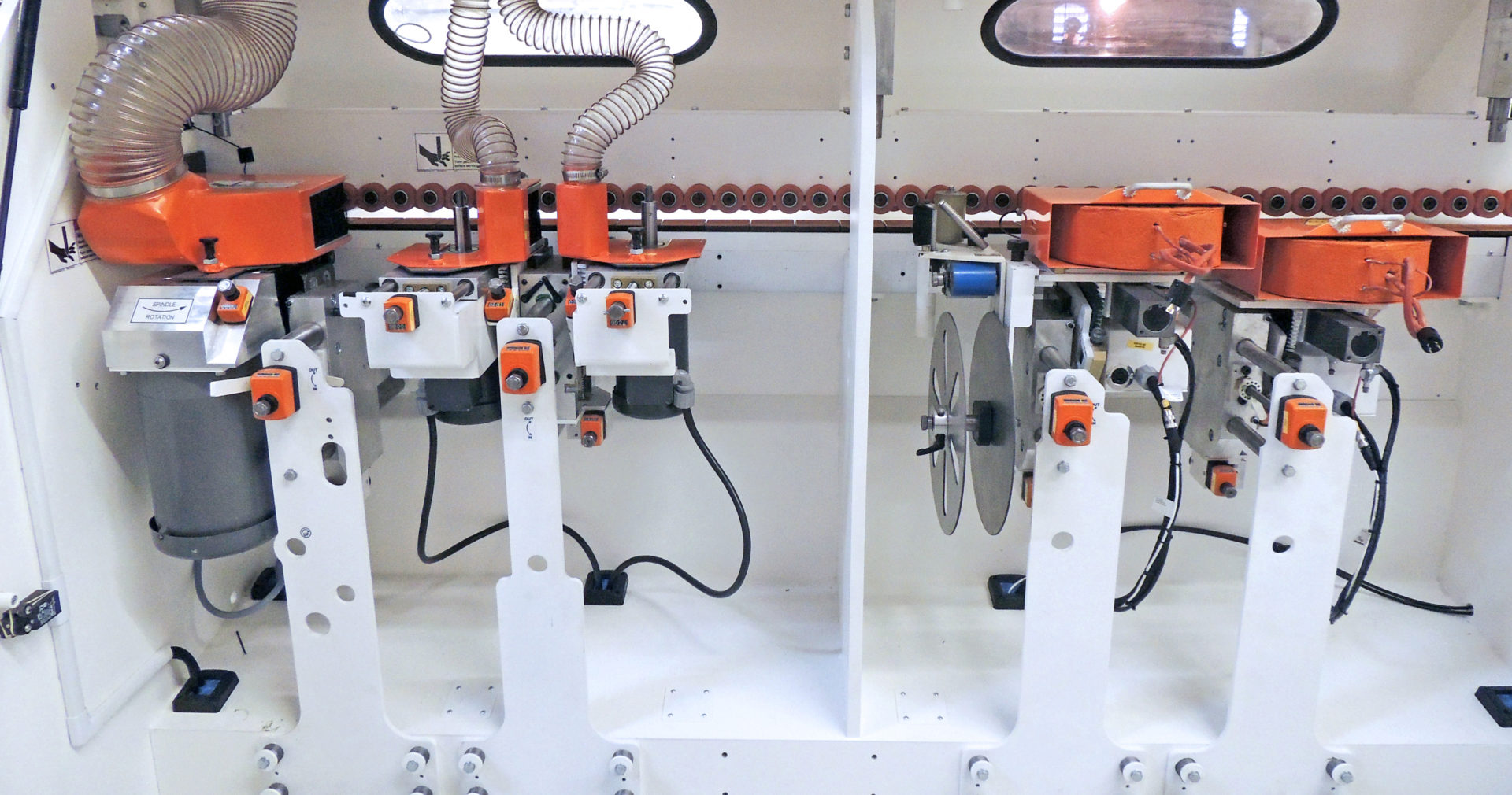 Shapes the profile, sands it smooth and applies the dry-transfer finish foil on MDF in a single continuous process. Stock is transported through the machine by a bottom-feed chain with special pads that grip the stock securely while it passes through the stations. The L117 Edge Foiler has digital readouts and micro-point tilt at the stations.